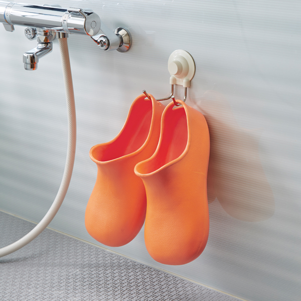 濡れた冷たいお風呂の床もへっちゃら!甲高で前からの水が入りにくい。やわらかく履き口が大きいので足入れしやすい! フックにかけて干したり収納できるフック用穴付き。すべりにくいクッション素材。ふっくらとした丸みのあるデザイン。
