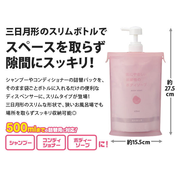 詰替用の袋ごとスッポリ!シャンプ―などの詰替に便利なディスペンサーです。省スペースで持ちやすいスリムボトルです。500mlまでの詰替え用に対応しています。