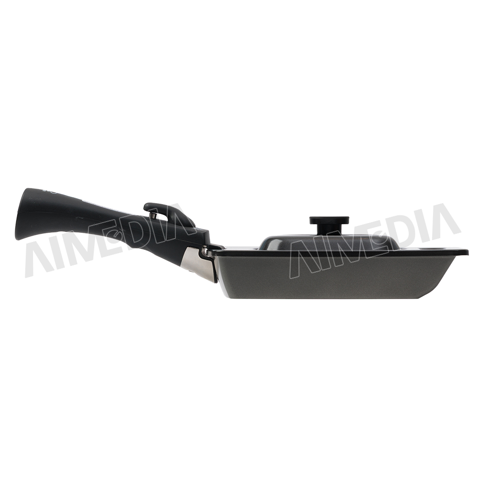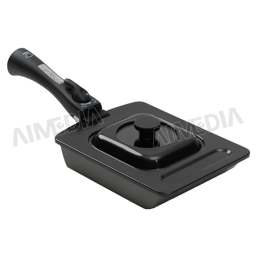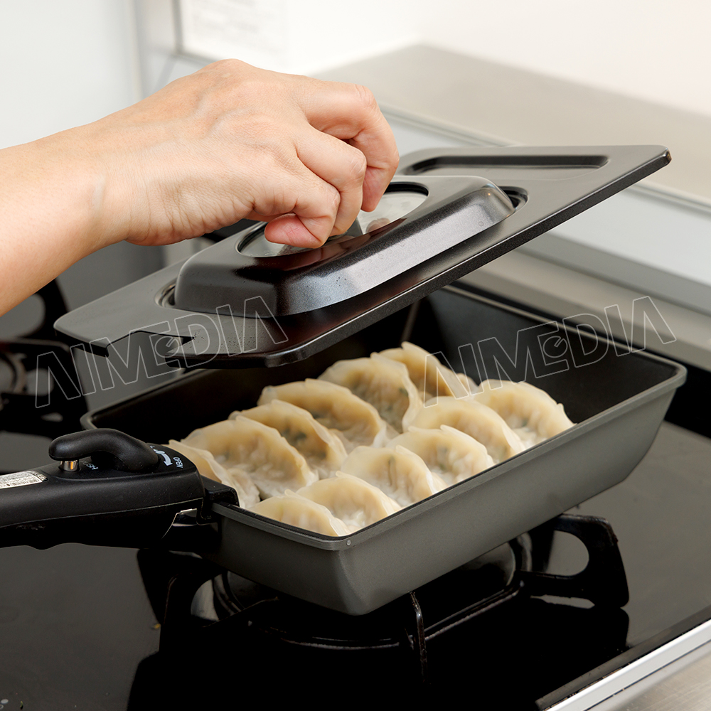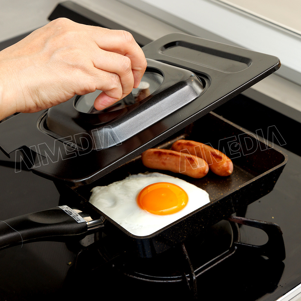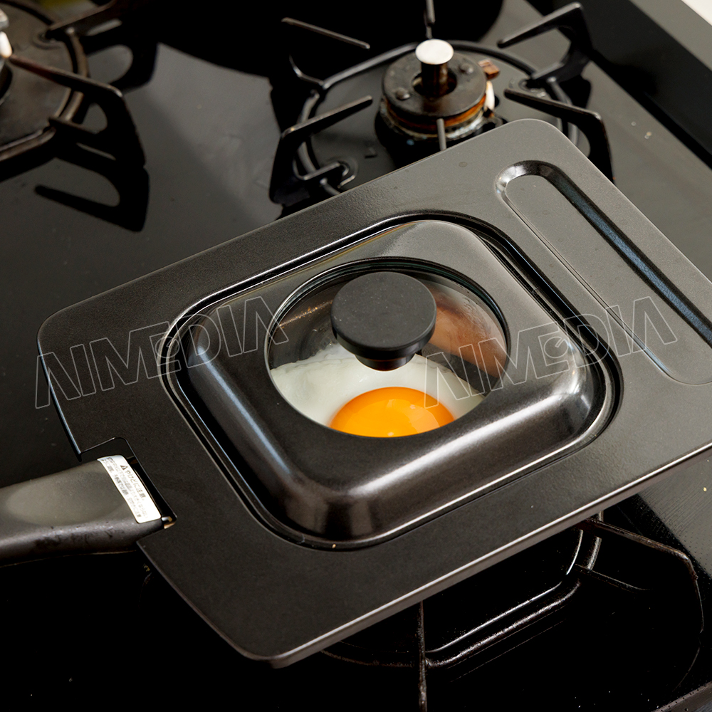 玉子焼き器に合わせたスクエアタイプの蓋。中身が見えるガラス窓付きで、焼き具合が確認でき便利です。こびりつきにくく、汚れを落としやすいふっ素樹脂加工。