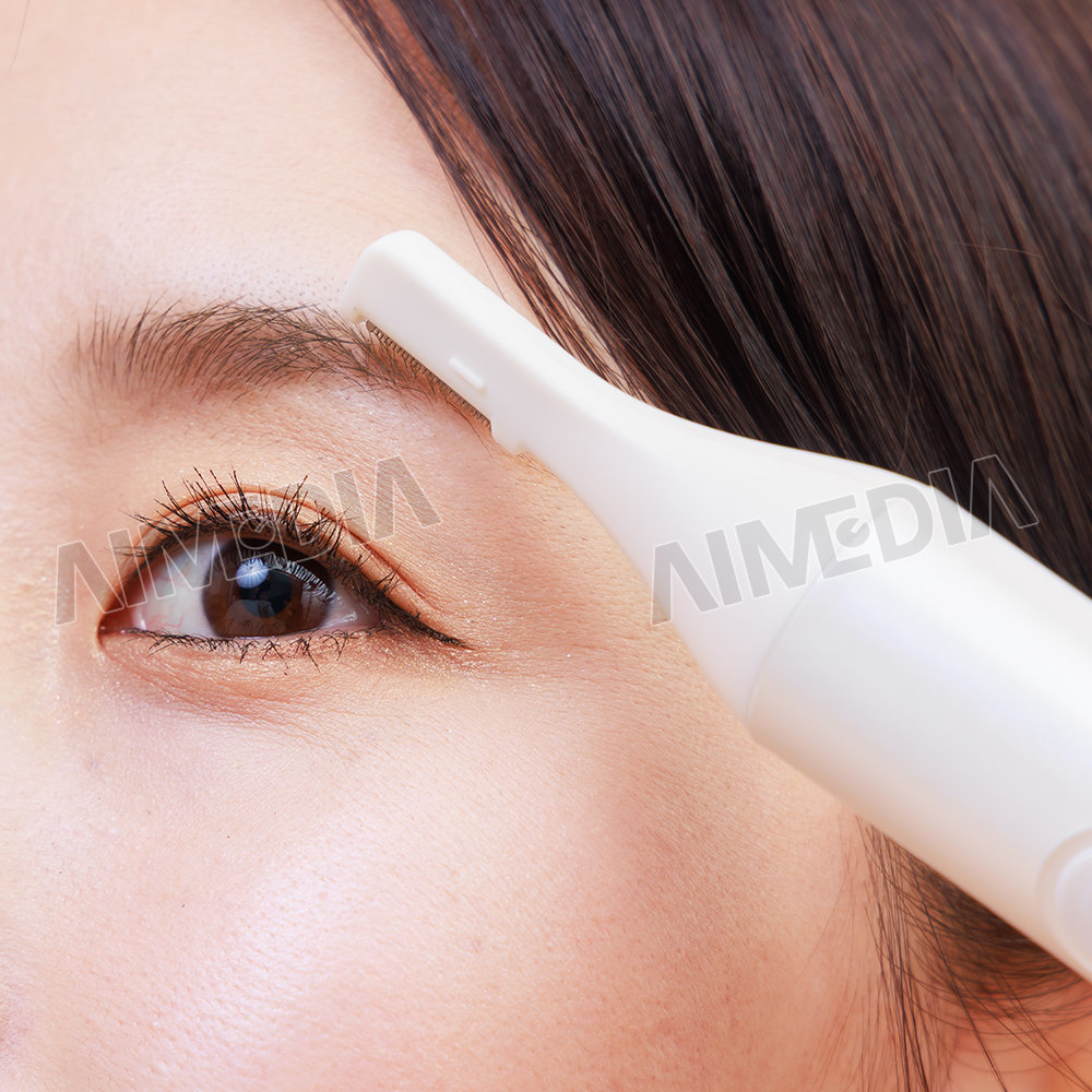コームを取り外した状態で、刃先をやや寝かせて矢印の方向にゆっくり動かして眉の形を整えてください。※手で肌をのばしながら剃ると、刃が動かしやすくなります。