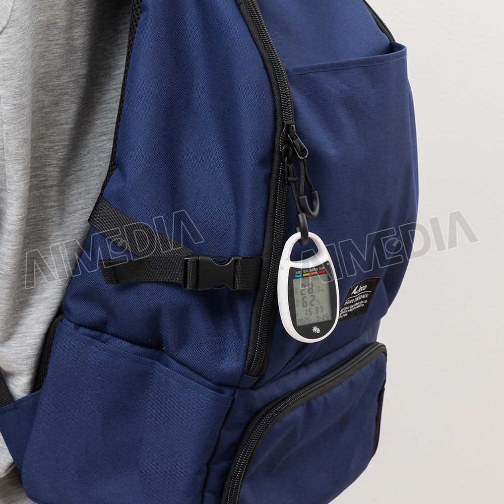 いつでもどこでも気温と湿度をチェック!カラビナフック付きで、バッグなどお好みの場所に簡単に取り付けられます。季節による自動切換えで「熱中症」もしくは「インフルエンザ」の注意レベルを表示します。※本品は環境状態の目安をお知らせするもので、これらを予防するものではありません。